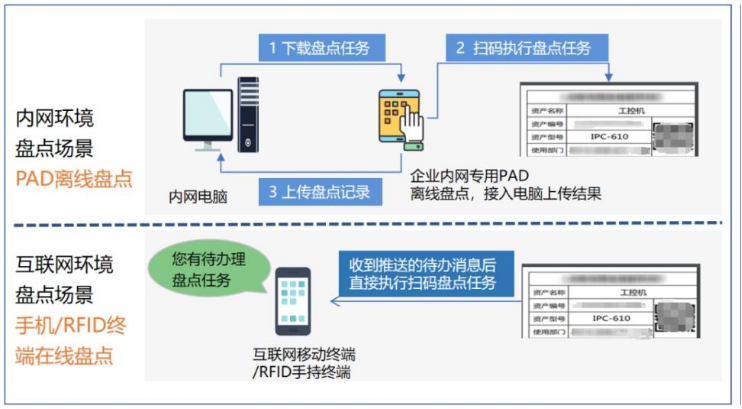移動智能應用:通過RFID等智能標簽和智能手持終端設備,實現在資產現場的快速數據采集,實現智能范圍管控和資產快速盤點。
