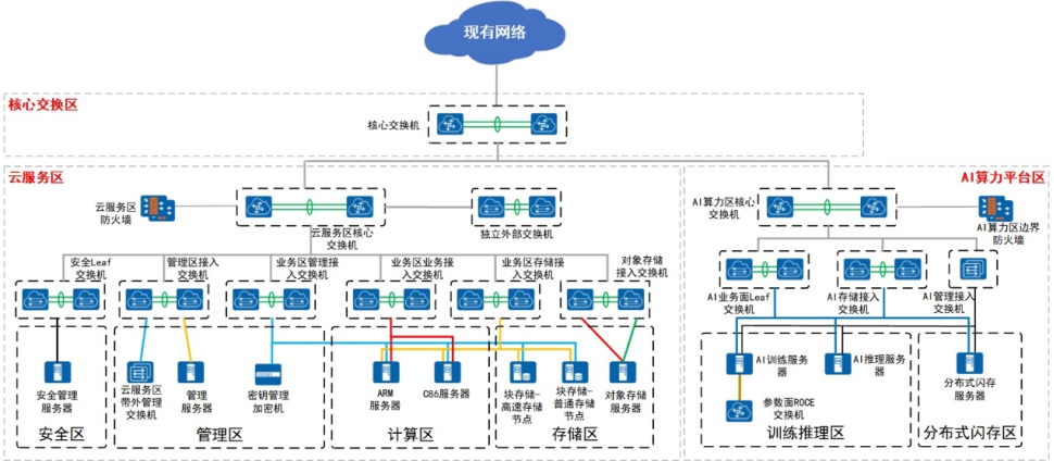 方案設計:根據需求分析結果,設計定制化的云數據中心基礎設施建設方案。涵蓋計算基礎設施、存儲基礎設施、網絡基礎設施、安全基礎設施、電力基礎設施、制冷基礎設施、機房設施、管理與監控系統等各個子系統的架構設計,確保各部分協同工作,滿足用戶長期發展需求。
