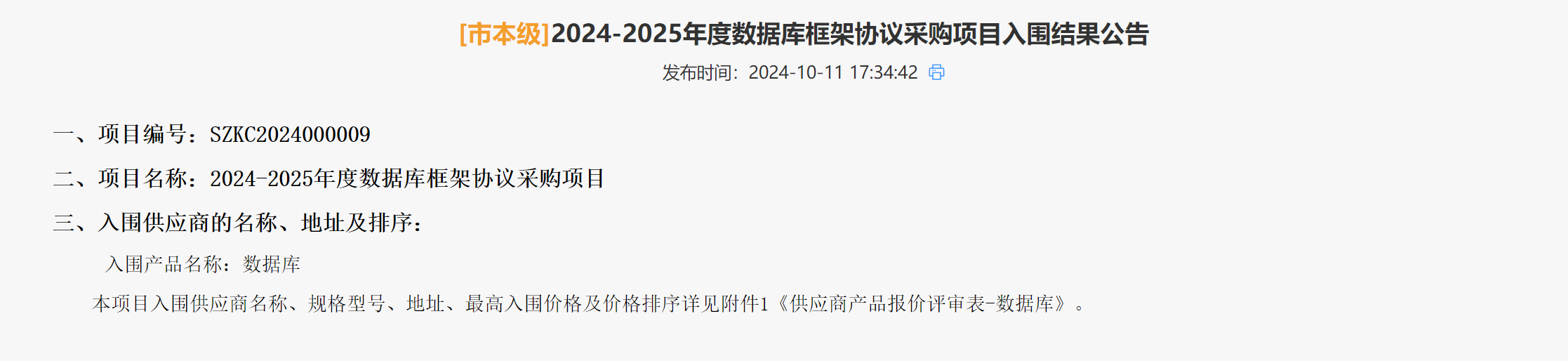 近日,深圳政府采購業(yè)務(wù)框架協(xié)議采購系統(tǒng)公布了《2024-2025年度數(shù)據(jù)庫框架協(xié)議采購項(xiàng)目》入圍結(jié)果公告,神通數(shù)據(jù)庫成功入圍。