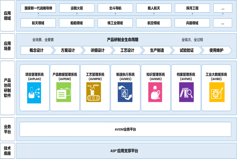 公司憑借在航天及國防軍工等復雜裝備研制信息化領域30余年的積累和實踐,形成了以AVIDM為品牌的核心工業軟件產品體系。AVIDM系列軟件主要包括項目管理系統 (AVPLAN)、產品數據管理系統(AVPDM)、工藝管理系統(AVMPM)、制造執行系統(AVMES)、知識管理系統(AVKMS)、數字檔案管理系統(AVFMS)和工業大數據系統(AVIBD)等子產品。